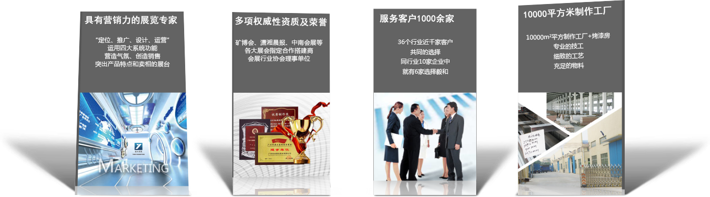 ??????長(zhǎng)沙毅和展覽服務(wù)有限公司成立于2011年,公司擁有專業(yè)的展覽設(shè)計(jì)、完善的設(shè)備、精細(xì)的制作,和全面完整的制作工廠.專業(yè)從事展會(huì)主場(chǎng)搭建,特裝展臺(tái)設(shè)計(jì)與制作,展示廳及專賣店設(shè)計(jì),大型會(huì)議活動(dòng)現(xiàn)場(chǎng)布置,以及展覽器材租賃為一體的專業(yè)化公司. 毅和成立以來(lái),在各位領(lǐng)導(dǎo)的關(guān)心和社會(huì)各界朋友的支持幫助下,通過(guò)自身地不斷努力,已在展覽行業(yè)得到同行的普遍認(rèn)可通過(guò)自身地不斷......